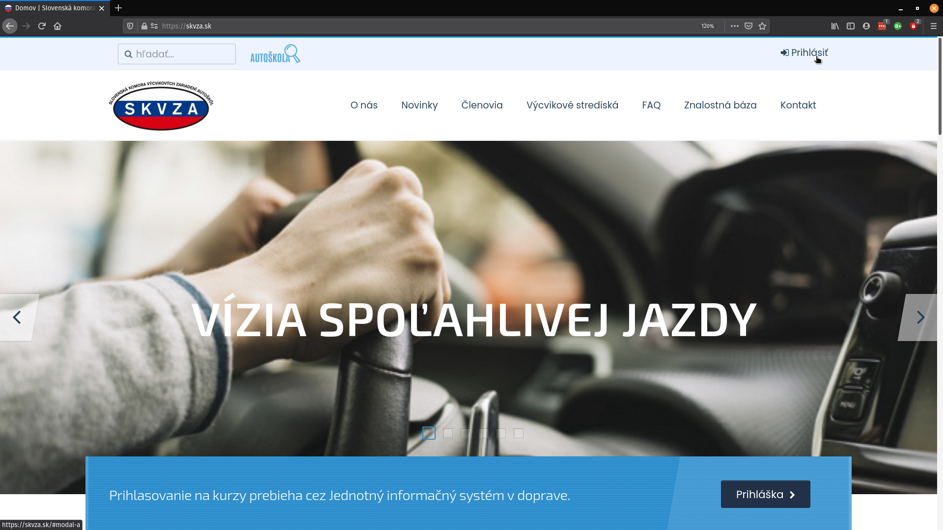1. Otvoríme prehliadač, prejdeme na adresu www.skvza.sk a klikneme na položku “Prihlásiť” (v pravom hornom rohu)