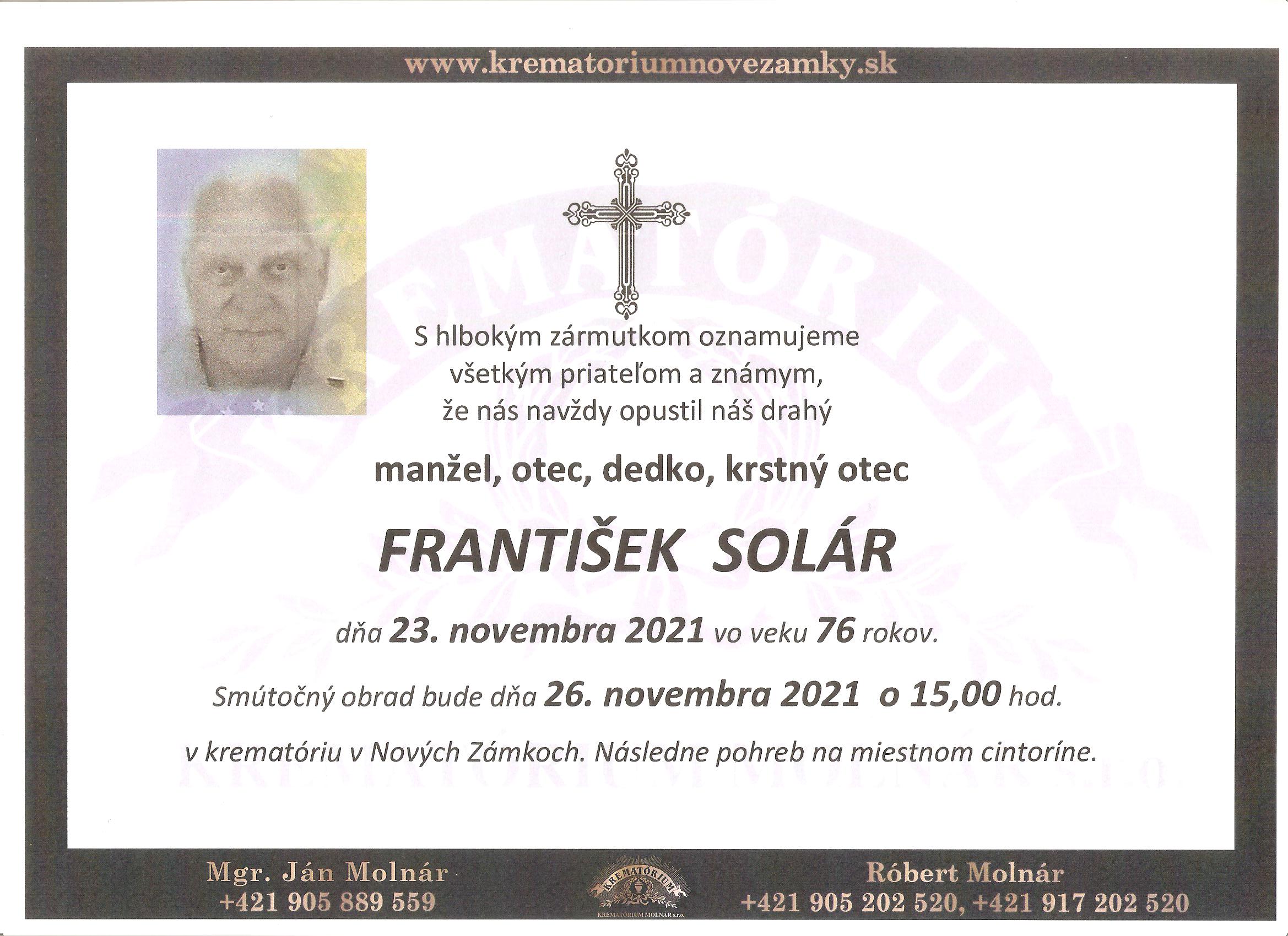 S hlbokým smútkom oznamujeme všetkým členom SKVZA a všetkým autoškolákom, že vo veku 76 rokov nás navždy opustil dlhoročný člen SKVZA a bývalý člen predstavenstva SKVZA František Solár.