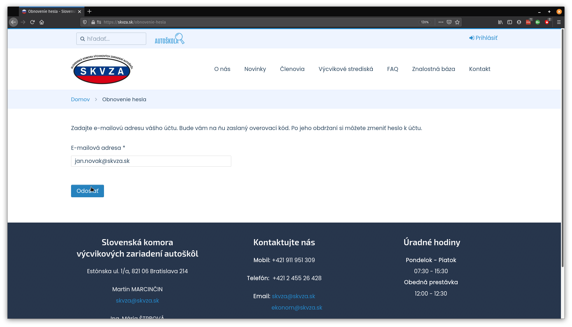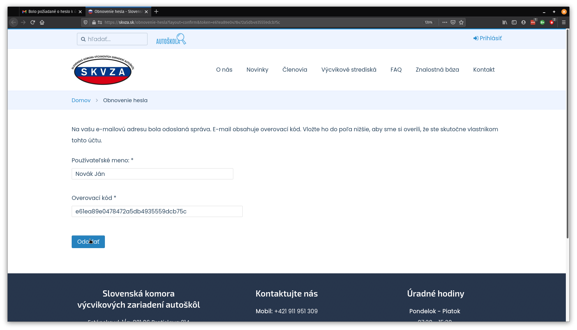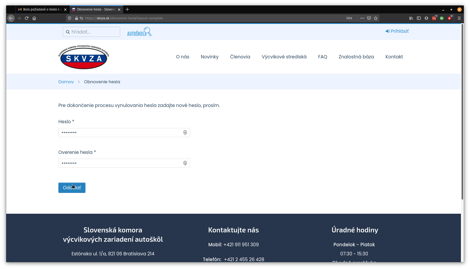 6. Ďalej sa nám otvorí stránka, kde je potrebné zadať nové heslo (pre overenie je potrebné zadať druhýkrát to isté heslo) a potom kliknúť na tlačidlo “Odoslať”.