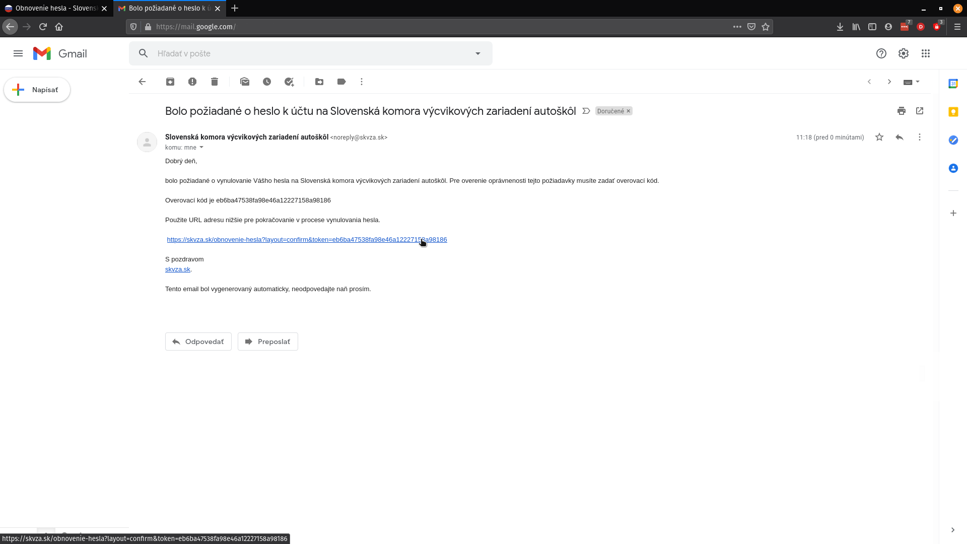 4. Prihlásime sa na email a otvoríme správu od Slovenskej komory výcvikových zariadení autoškôl.