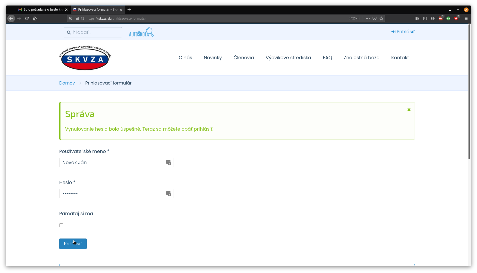 7. Teraz sa môžeme prihlásiť do členskej zóny skvza zadaním používateľského mena v tvare "Priezvisko Meno" a nového hesla, ktoré sme si zvolili.