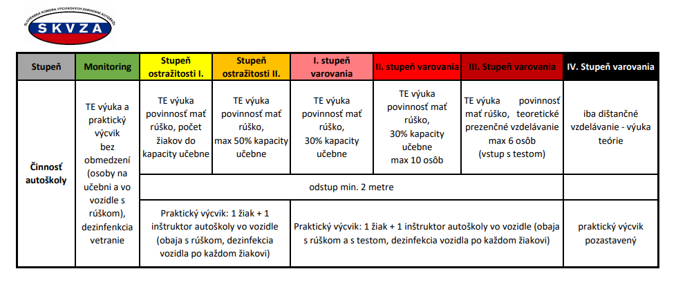 Našu hlavnú činnosť – vzdelávanie a príprava nových vodičov všetkých skupín vodičských oprávnení budeme môcť vykonávať až po uvoľnení Lockdownu a podľa stupňa v jednotlivých regiónoch bude regulovaná úradom verejného zdravotníctva. Vypracovali sme návrh „COVID automatu“, ktorý Vám uverejňujeme, ale pripomínam, že je to zatiaľ iba náš návrh a nemožno podľa neho teraz nič realizovať.